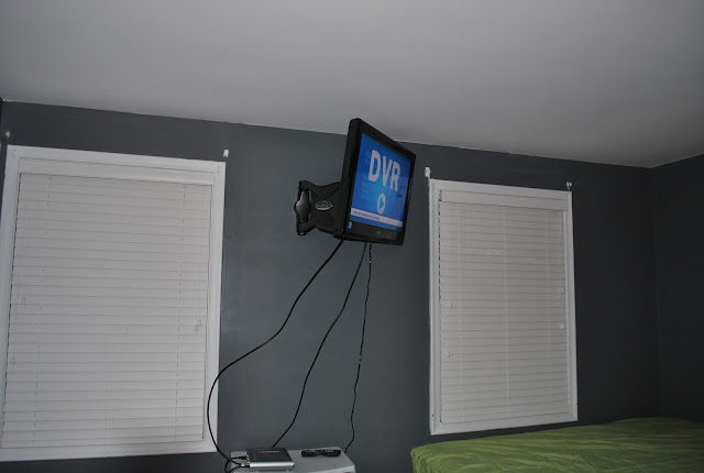 yay! for Black Friday the only thing we got this year was a nice Big Tv for only $180 I know its a bit BIG for 3 small boys but hey they are going to grow up one day . So now onto hanging it on the wall the reason why I think hanging it on the wall is perfect for their room is because the layout of the room there really is no other way to put it where they can see it . Big found me a swivel wall hanger which is perfect. The only thing we need to do now is lower it , it ended up way to high we think plus the plug cant go flush against the wall right now since it is not long enough . I really want to do what what House of Hepworths did with her cords , brilliant stop over and check out her post .